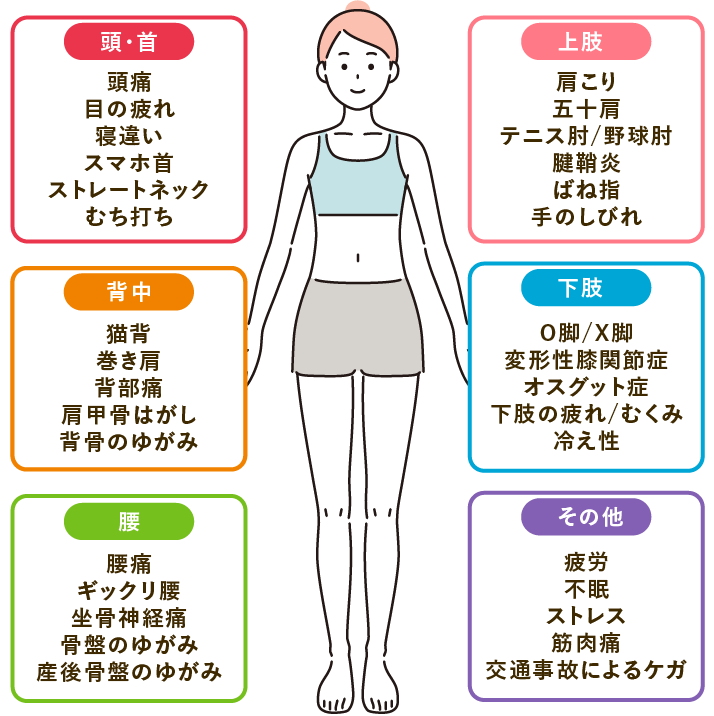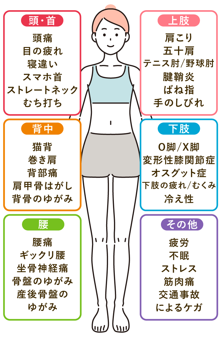 「もみほぐし」「ストレッチ」「骨格矯正」で