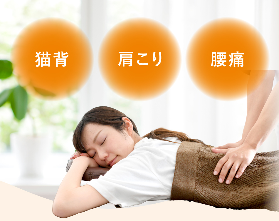 背骨(頸椎、胸椎、腰椎)を整えることによって姿勢の改善や神経と血液の流れが良くなり、もみほぐしの効果も上がります。